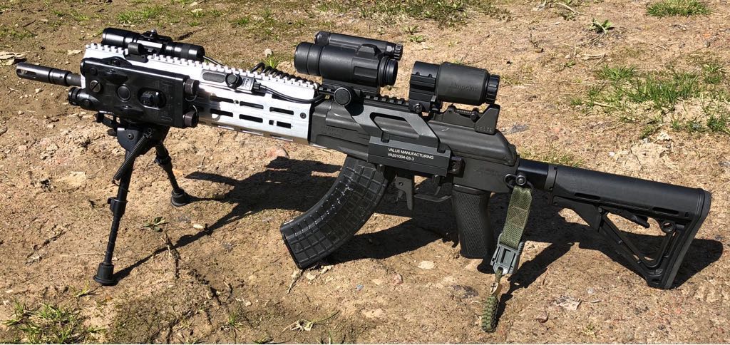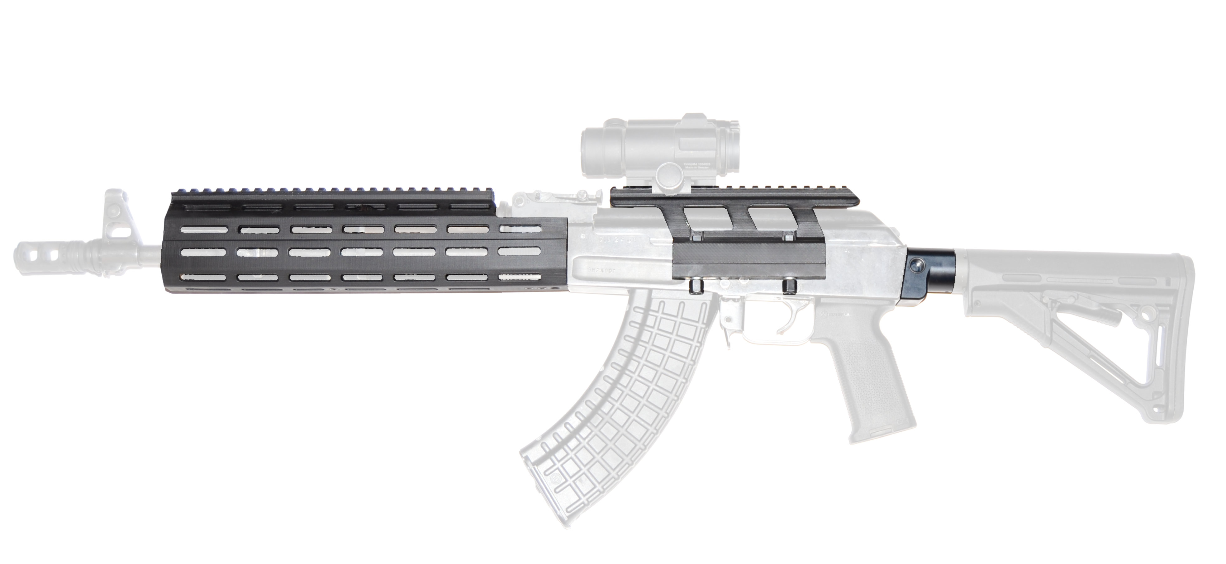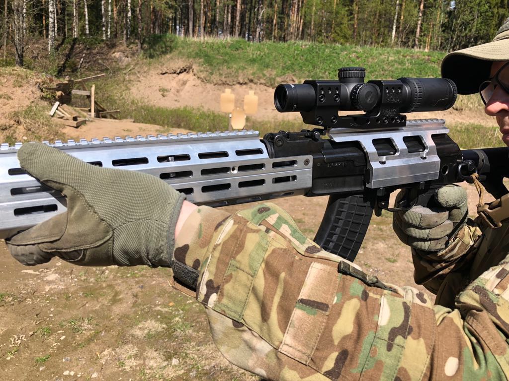 AK:sta on melko helppo irrotella etutähtäin ja kaasuportti (kartiotapit irtoaa melko sievästi) ja sitten pääseekin liu'uttamaan etukädensijan kiinnityshelan pois piipun ympäriltä. AK:n erillinen hihnalenkki on myös tällöin helppo jättää pois. Sitten vaan kaasuportti ja etutähtäin takaisin paikalleen. Eli ei tarvetta leikellä mitään ja aseen voi palauttaa halutessaan alkuperäiseksi. M-Lok kädensijan kiinnitys voisi hyvinkin perustua piipun ympäri tuleviin pantoihin/kiinnitysosaan (Midwest Industries ratkaisu on ihan jees, paitsi ettei toimi Ultimak kaasuputken kanssa kun molempien kiinnityskohdat tulevat samoille paikoille). AK:n kaasumännän suojaputkessa olevat kädensijan kiinnityshelat ovat melkoiset ulokkeet, jotka rajoittavat sitä, miten solakaksi/matalaksi kädensijan yläosan voi muotoilla. Helaton kaasumännän suojaputki olisi hyvä lisävaruste, jos alkuperäistä ei halua leikellä (ylijäämänä saattaisi löytyä edullisestikin sopivia aihioita virittelyyn).
