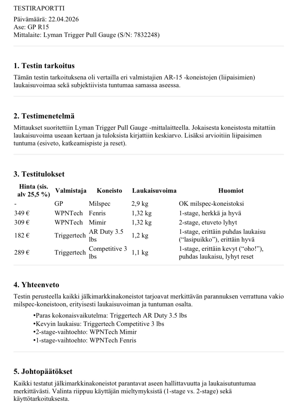 Laitettiin yhteismitallisiksi eri valmistajien laukaisukoneistoja, subjektiiviset näkemykset ja objektiiviset mittaustulokset löytyvät kuvasta.